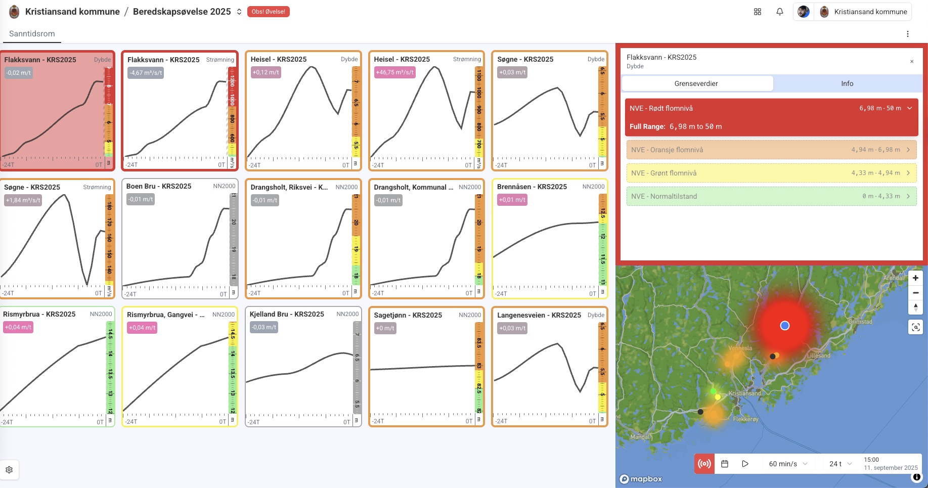 About 25 key personnel gathered from municipal divisions under the leadership of Sigurd Paulsen, Kristiansand’s chief of emergency. Connected online was a network of representatives from the police, fire and rescue, Glitre Energig and Norwegian Water Resources and Energy Directorate (NVE).Local media followed parts of the simulation, including NRK Sørlandet. Everyone had the same goal: to practice, with realism, how the community would respond if severe rain once again pushed the region to the brink.